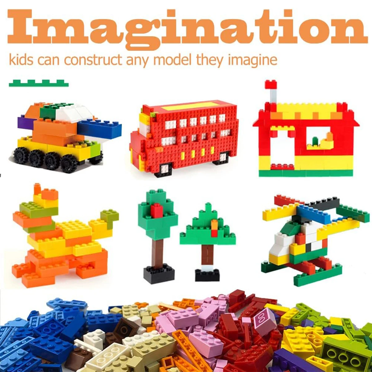 • More pieces :1100 Pieces high-quality basic building bricks toys.The set comes with many pieces of different sizes, thicknesses, and colors. It also has tires to make cars, trucks, etc.
