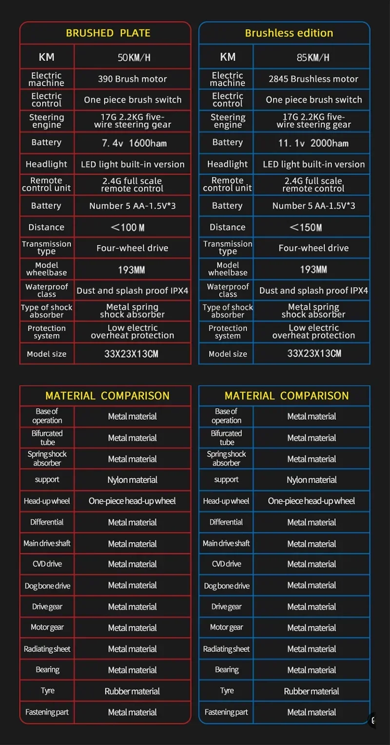 50KM/H is the brush version, 85KM/H is the super brushless version, please pay attention to the distinction between buyers