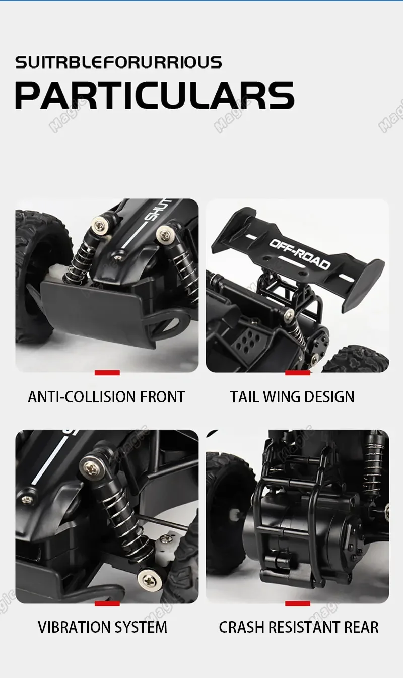 Designed with a detailed simulation structure, sleek off-road tires, and a shockproof suspension system, this RC monster truck is built to handle obstacle courses, jumps, and stunt tricks. Ideal for RC racing enthusiasts, hobbyists, and children eager to explore outdoor terrains and challenge their driving skills.