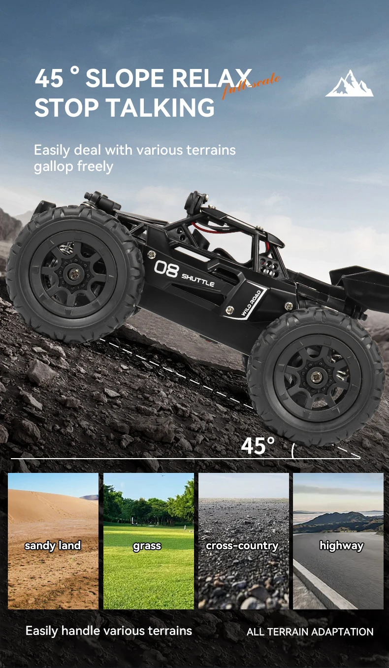 Alloy metal body, spring shock absorbers, and rugged rubber tires for ultimate durability. It easily handles grass, dirt, gravel, and 45°slopes, making it the perfect off-road RC car for outdoor adventures.
